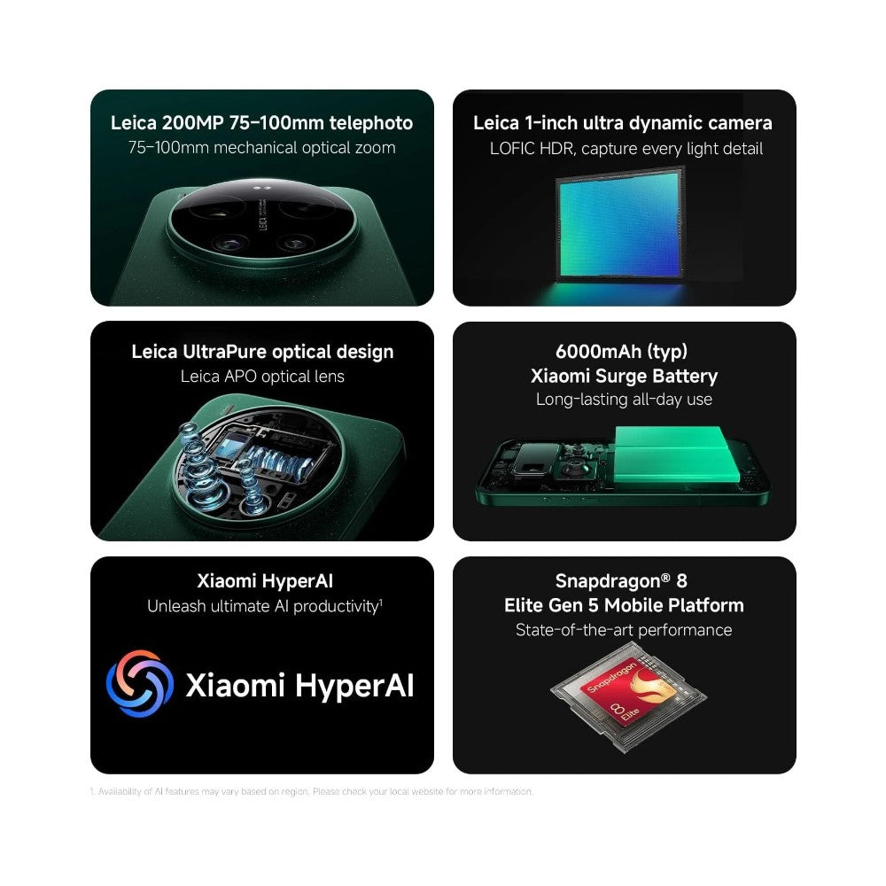 The Xiaomi 17 Ultra delivers next-level flagship performance with Leica-powered photography and cutting-edge AI technology. Featuring a 200MP Leica 75–100mm telephoto lens with mechanical optical zoom, plus a 1-inch ultra dynamic main camera with LOFIC HDR, it captures stunning detail in every lighting condition. Built with Leica APO UltraPure optical design for professional clarity. Powered by the Snapdragon® 8 Elite Gen 5 processor and a massive 6000mAh Xiaomi Surge Battery for all-day performance. Enhanced with Xiaomi Hyper AI for smarter productivity and seamless everyday use. A true ultra-premium smartphone built for power users and photography enthusiasts alike.