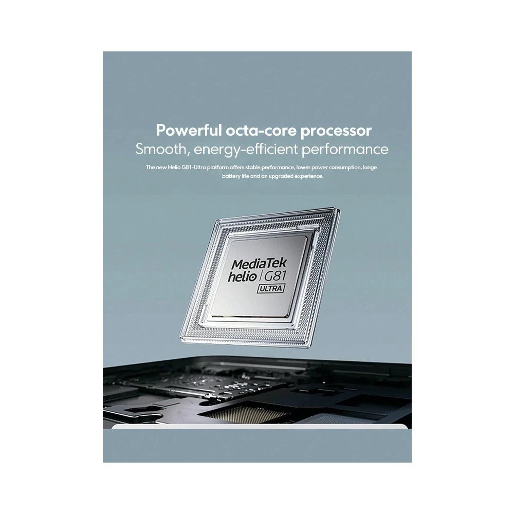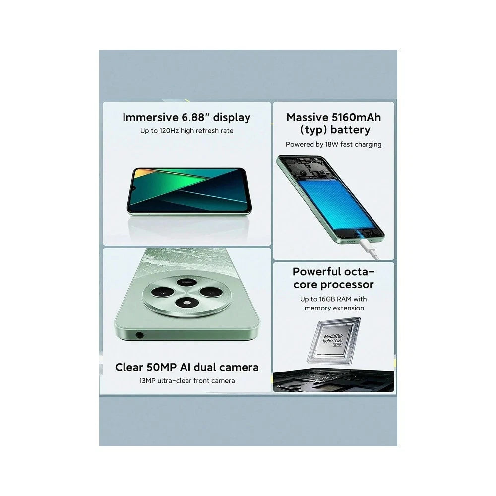 Measuring just 8.2 mm thin, this smartphone combines everyday practicality with modern style. The large 6.88" HD+ display (720 × 1640 pixels) features a smooth 120 Hz refresh rate, perfect for scrolling, streaming, and gaming.
